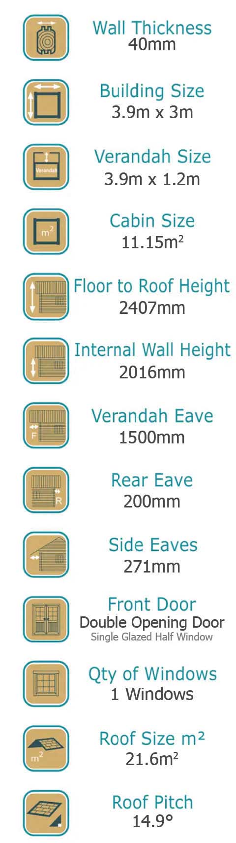 Overall Floor Space 3m x 3.9m = 11.15m² in total. Also included is a 3.9m x 1.2m wide Verandah. Total combined area = 16.2m²