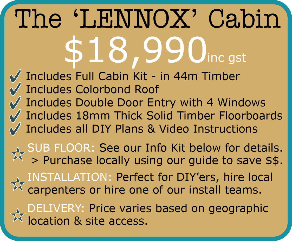 Anywhere in Australia Possible- Delivery price depends on a few factors. Your geographical location, crane truck access on your site and the exact content of your cabin kit.